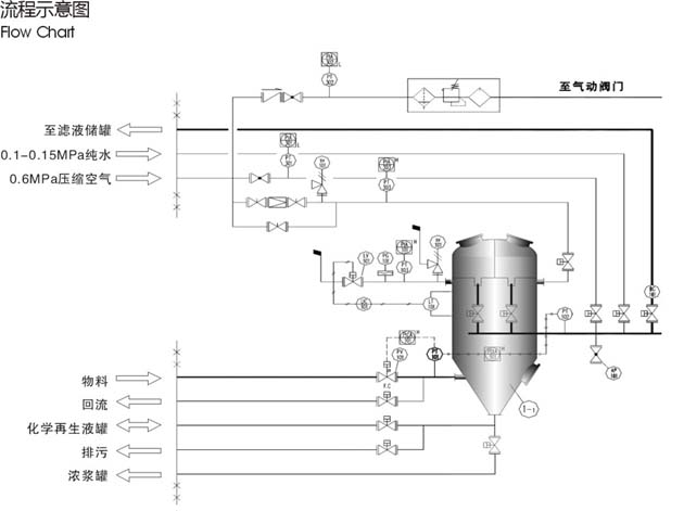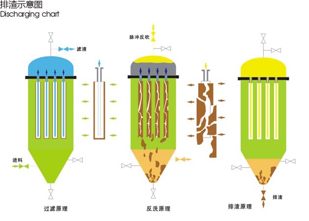 1、在立式密闭机体内悬挂微滤管为主过滤区,并设备底部的气动排渣底盖上设有带过滤平板的辅助过滤区。